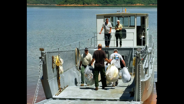 The National Forest Service said dozens of workers spent five hours cleaning up debris left behind over the weekend on Slaughterhouse Island in Lake Shasta.
