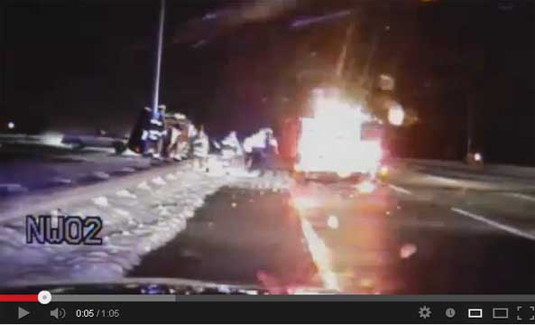 The video, posted on YouTube by FOX 45, shows a pickup truck crash into another car that crashed earlier along U.S. 35 in Dayton. As Dayton Fire Capt. Barry Cron approached the truck, a third vehicle lost control and was going to hit the truck. Cron tried to flee, but the impact pushed the truck into the fire captain, sending him flying into the guardrail.
