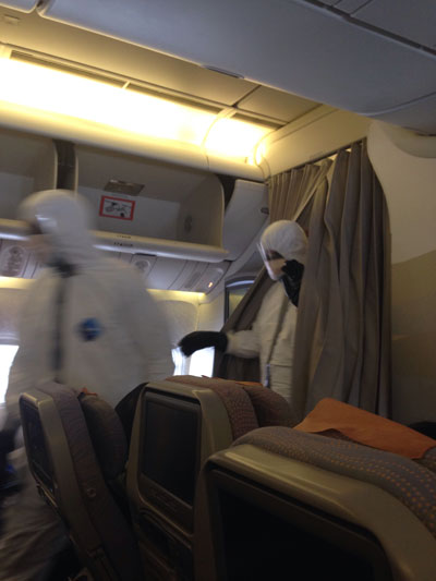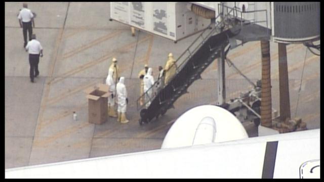 Emergency crews responded to the health situation on Emirates Flight 237 when it arrived at the gate from Dubai at 2:30 p.m. Five passengers were experiencing flu-like symptoms, according to the Massachusetts Port Authority. Emergency responders, wearing protective clothing, entered the plane to assess the passengers and help them off the plane. State Police said the two passengers with fevers were removed from the flight first.