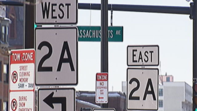 A Route 9 West sign on Massachusetts Ave. sends people straight ahead and to the right, instead of only right.