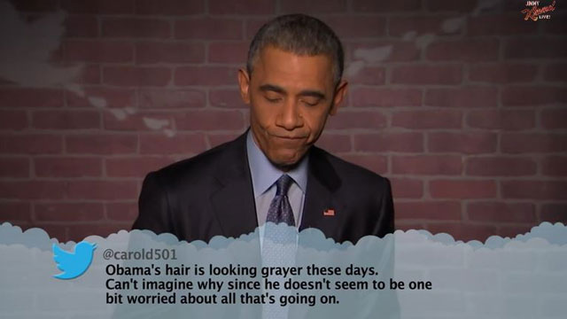 MyFoxBoston.com) -- President Barack Obama, in appearing on Jimmy Kimmel Live Thursday evening, took part in the talk show host's "Mean Tweets" segment.