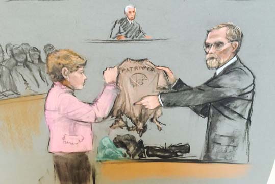 MyFoxBoston.com) -- The blood-stained, shredded New England Patriots T-shirt 8-year-old Martin Richard wore at the Finish Line of the Boston Marathon was displayed in open court Monday in the trial of his accused killer and admitted Boston Marathon bomber Dzhokhar Tsarnaev.
