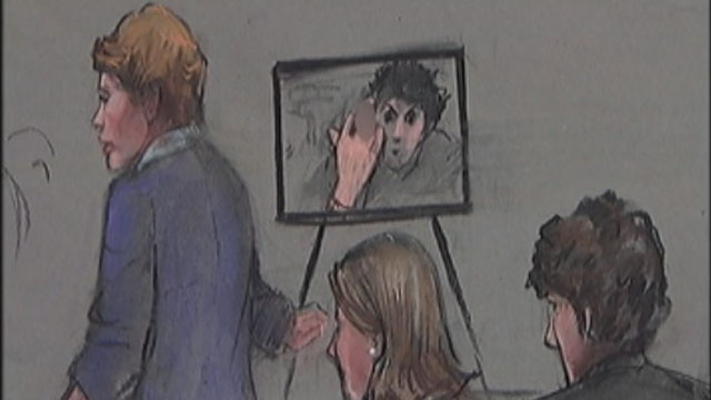 MyFoxBoston.com) -- Boston Marathon bomber Dzhokhar Tsarnaev showed no emotion in the courtroom Tuesday for the start of the penalty phase of his trial. In contrast, prosecutor Nadine Pellegrini showed the jurors a photo captured on a surveillance camera in his cell three months after the bombings, making an obscene gesture with his middle finger.