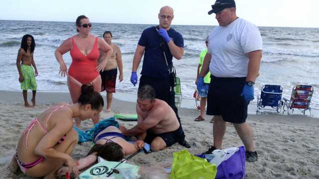Officials credited life-saving efforts by beach bystanders. Both victims were airlifted to a Wilmington hospital on Sunday night with life-threatening injuries and underwent surgery.