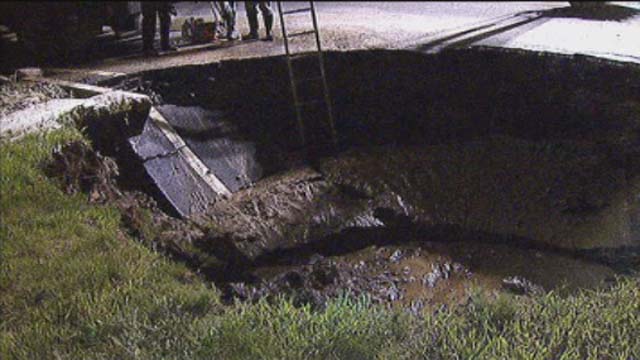 The break happened around 7 p.m. on Tuesday, causing a huge hold to open up on the road.